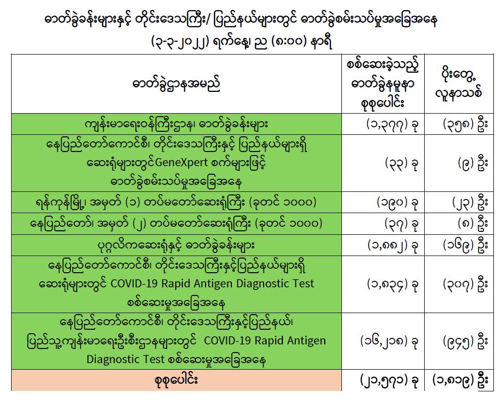 သို့ဖြစ်ပါ၍ ယနေ့အထိ ဓာတ်ခွဲနမူနာစုစုပေါင်း (၇,၁၈၇,၃၃၇) ခုအား စစ်ဆေးခဲ့ပြီး COVID-19 ဓာတ်ခွဲ အတည်ပြုလူနာ စုစုပေါင်း (၅၉၃,၉၅၈) ဦး ရှိပြီ ဖြစ်ပါသည်။