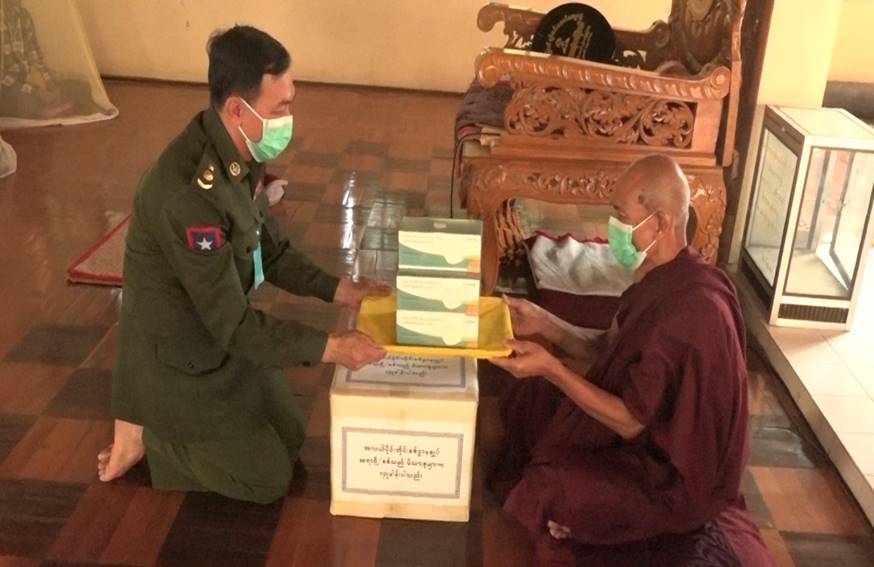 ထိုသို့ဆောင်ရွက်လျက်ရှိရာ ယနေ့တွင် ရှမ်းပြည်နယ်(အရှေ့ပိုင်း)၊ မိုင်းဆတ် မြို့ရှိ မြို့မဘုန်းတော်ကြီး ကျောင်း၊ ဓာတ်စွမ်းဟုန်ဘုန်းတော်ကြီးကျောင်း၊ သဗ္ဗညု ဘုန်းတော်ကြီးကျောင်း၊ ပရဟိတ ဘုန်းတော်ကြီးကျောင်း၊ ရန်ကုန်တိုင်းဒေသကြီး၊ မရမ်းကုန်းမြို့နယ်၊ အမှတ်(၅)ရပ်ကွက်ရှိ ပင်မဗုဒ္ဓဝါဒီ ကျောင်းတိုက်၊ ဧရာဝတီတိုင်း ဒေသကြီး၊ ပုသိမ်မြို့ရှိ ဆုတောင်းပြည့်ကျောင်းတိုက်၊ ရခိုင်ပြည်နယ်၊ အမ်းမြို့ရှိ မြို့ဦးဘုန်းတော်ကြီးကျောင်းတိုက်၊ တောင်ကုတ်မြို့ရှိ မဟာသန္တိသုခဘုန်းတော်ကြီး ကျောင်းတိုက်၊ စစ်တွေမြို့ရှိ တြွီတဲဘုန်းတော်ကြီးကျောင်းတိုက်၊ မြောက်ဦးမြို့ရှိ မြို့သစ်ပရိယတ္တိ စာသင်တိုက်၊ မဟာဝိဇယျရံသီဘုန်းတော်ကြီးကျောင်းတိုက်၊ နတ် တောင်ဘုန်းတော်ကြီးကျောင်းတိုက်၊ စစ်ကိုင်းတိုင်းဒေသကြီး၊ ကလေးမြို့ရှိ ပင်လုံ တပ်ဦးပရိယတ္တိစာသင်တိုက်နှင့် မန္တလေးတိုင်းဒေသကြီး၊ ပုသိမ်ကြီးမြို့နယ်၊ ရန်ကင်း အေးငြိမ်းရိပ်သာကျောင်းတိုက်တို့ရှိ ဆရာတော်၊ သံဃာတော်များ၊ သာသနာနွယ်ဝင် သီလရှင်များအား ဆွမ်းဆန်တော်၊ ဆီ၊ ဆား၊ ပဲ အမယ်လေးမျိုး၊ နဝကမ္မ အလှူငွေများ၊ ကိုဗစ်-၁၉ ရောဂါကာကွယ်ရေး အထောက်အကူပြုပစ္စည်းများ၊ နေ့ဆွမ်း များနှင့် လှူဖွယ်ပစ္စည်းများကို သက်ဆိုင်ရာ တိုင်းစစ်ဌာနချုပ် အသီးသီးမှ တာဝန်ရှိသူများက သွားရောက်ဆက်ကပ် လှူဒါန်း ခဲ့ကြကြောင်း သတင်းရရှိသည်။