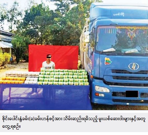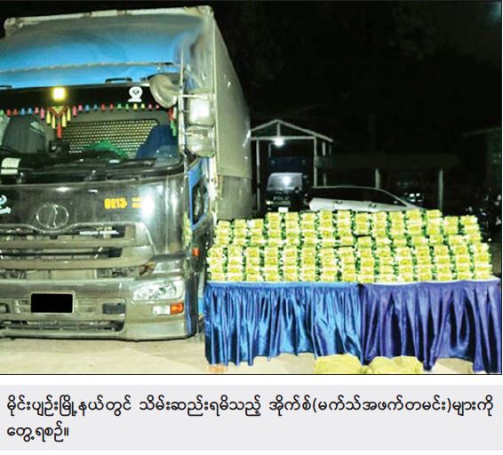 မူးယစ်ဆေးဝါး တားဆီးနှိမ်နင်းရေးရဲတပ်ဖွဲ့ဝင်များ ပါဝင်သော ပူးပေါင်းအဖွဲ့သည် ဖေဖော်ဝါရီ ၂၆ ရက် ညနေ နာရီခွဲတွင် ရှမ်းပြည်နယ်(တောင်ပိုင်း) ကွန်ဟိန်းမြို့နယ် တောင်ကြီး - တာချီလိတ်သွား ကားလမ်း တာကော်တံတား ပူးပေါင်းစစ်ဆေးရေးစခန်းတွင် ကာလိမှ မိုင်းပျဉ်း ဘက်သို့ စိုင်းပေါင်းနွံခမ်း (ခ) ခမ်းဟန်စင့်(၃၀)နှစ် မောင်းနှင်လာသည့် Nissan Diesel ၁၂ ဘီး ယာဉ်ကို သတင်းအရ ရှာဖွေရာ အိုက်စ် (မက်သ်အဖက်တမင်း) ကီလို ၁၅၀ နှင့် စိတ်ကြွရူးသွပ်ဆေးပြား ကိုးသိန်း သိမ်းဆည်းရမိခဲ့ပြီး သတင်းကွင်းဆက်အရ ၂၇ ရက် နံနက် ၁၀ နာရီတွင် ရှမ်းပြည်နယ် (အရှေ့ပိုင်း) မိုင်းပျဉ်းမြို့နယ် တောင်ကြီး -တာချီလိတ် သွားကားလမ်း မိုင်တိုင်အမှတ် (၂၈၄)အနီး ကားလမ်းဘေးတွင် ရပ်တန့်ထားသည့် Nissan Diesel ၁၂ ဘီးယာဉ်ကို စစ်ဆေးရှာဖွေရာ  အိုက်စ် (မက်သ်အဖက်တမင်း) ကီလို ၄၀၀ ထပ်မံသိမ်းဆည်းရမိခဲ့သဖြင့် ဒေသကာလတန်ဖိုး ငွေကျပ် ၅ဒသမ ဘီလီယံကျော် တန်ဖိုးရှိ စုစုပေါင်း အိုက်စ်(မက်သ် အဖက်တမင်း) ၅၅၀ ကီလို၊  စိတ်ကြွရူးသွပ်ဆေးပြား ကိုးသိန်း သိမ်းဆည်းရမိခဲ့ကြောင်း၊ စစ်ဆေး ဖော်ထုတ်ချက်များအရ သိမ်းဆည်းရမိ မူးယစ်ဆေးဝါးများကို ရှမ်းပြည်နယ်(အရှေ့ပိုင်း) နယ်စပ်မှ  တစ်ဆင့် ပြည်ပသို့ သယ်ဆောင်ခြင်းဖြစ်ကြောင်း သိရသဖြင့် ဥပဒေအရ အရေးယူထားရှိပြီး ကွင်းဆက်ပြစ်မှုကျူးလွန်သူများကို ဆက်လက်စစ်ဆေး ဖော်ထုတ်လျက်ရှိကြောင်း သိရသည်။