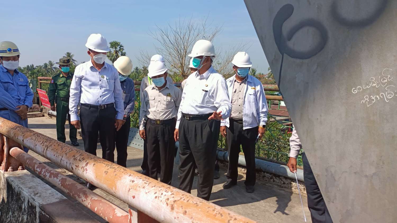 ထို့နောက် ပြည်ထောင်စုဝန်ကြီးသည် ဧရာဝတီတိုင်းဒေသကြီး ဝန်ကြီးချုပ် ဦးတင်မောင်ဝင်း နှင့်အတူ ဒေးဒရဲတံတားသို့ ရောက်ရှိပြီး တံတားပေါ်ရှိ ယာယီရှင်းလင်းဆောင်တွင် တာဝန်ရှိသူများက လုပ်ငန်းကဏ္ဍအလိုက် ရှင်းလင်းတင်ပြရာ ပြည်ထောင်စုဝန်ကြီးနှင့် ဝန်ကြီးချုပ် တို့က ယခုတံတားသည် ဧရာဝတီမြစ်၏အောက်ပိုင်း တောင်ဘက်အစွန်ဆုံးကျသည့် တံတားကြီး ဖြစ်ပါကြောင်း၊ တံတား တည်ဆောက်ရေးလုပ်ငန်းများကို ၂၀၀၀ ပြည့်နှစ်တွင် စတင်ဆောင်ရွက် အသုံးပြုခဲ့ပါကြောင်း၊ တံတားကြီးကို ကြံ့ခိုင်မှုရှိစေရန်နှင့် ရေရှည်အသုံးပြုနိုင်ရန် မြန်မာ အင်ဂျင်နီယာများနှင့် ဂျပန်နိုင်ငံမှပညာရှင်များပူးပေါင်းပြီး ပြင်ဆင်ထိန်းသိမ်းမှုကိုလည်း အားရ ကျေနပ်မှုရှိပါကြောင်း၊ ယခု တံတားကြီးကို ရေရှည်တည်တံ့ခိုင်မြဲရေးအတွက် အထူးအလေးထားပြီး ဆက်လက်ထိန်းသိမ်းသွားရန် မှာကြားပြီး တံတားသံပေါင်များ ပြင်ဆင်ထိန်းသိမ်းခြင်းလုပ်ငန်း ဆောင်ရွက်နေမှုကိုသွားရောက် ကြည့်ရှုစစ်ဆေးသည်။