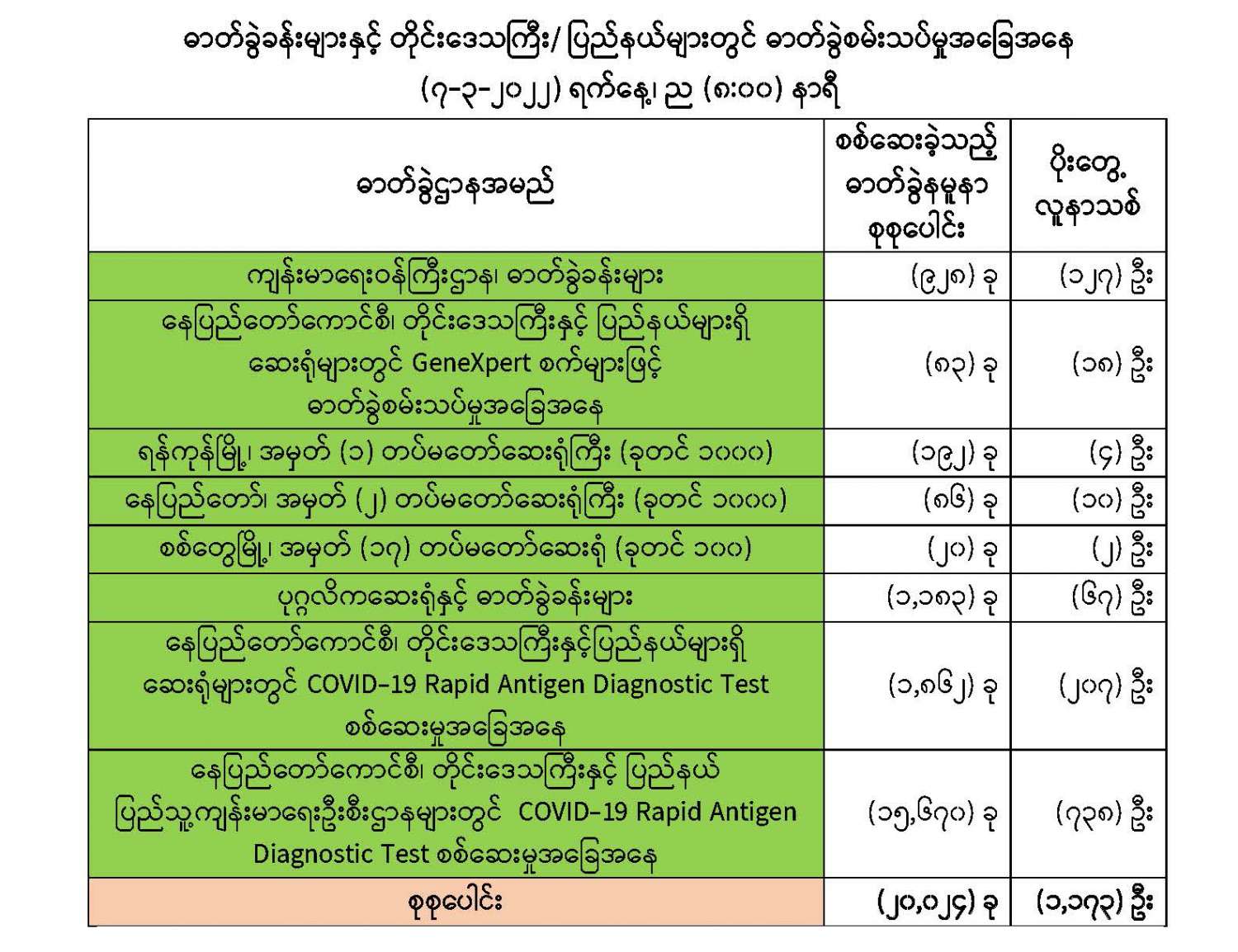 COVID-19 သံသယလူနာများ၊ ဓာတ်ခွဲအတည်ပြုလူနာနှင့် အနီးကပ်ထိတွေ့ခဲ့သူများနှင့် အသွားအလာကန့်သတ်ထားရှိသူများအား COVID-19 ရောဂါ ရှိ၊ မရှိ ဓာတ်ခွဲစမ်းသပ်စစ်ဆေးခြင်း အား ပုံမှန်ဆောင်ရွက်လျက်ရှိပြီး (၆-၃-၂၀၂၂) ရက်နေ့၊ ည (၈:၀၀) နာရီမှ (၇-၃-၂၀၂၂) ရက်နေ့၊ ည (၈:၀၀) နာရီအတွင်း ဓာတ်ခွဲနမူနာစုစုပေါင်း (၂၀,၀၂၄) ခုအား စစ်ဆေးပြီးစီးခဲ့ရာ COVID-19 ရောဂါ ဓာတ်ခွဲအတည်ပြုလူနာသစ် (၁,၁၇၃) ဦး တွေ့ရှိရပါသည်။ ထို့ကြောင့် ယနေ့အတွက် ရောဂါ ပိုးတွေ့ရှိမှု ရာခိုင်နှုန်းမှာ (၅.၈၆) ရာခိုင်နှုန်း ရှိပါသည်။
