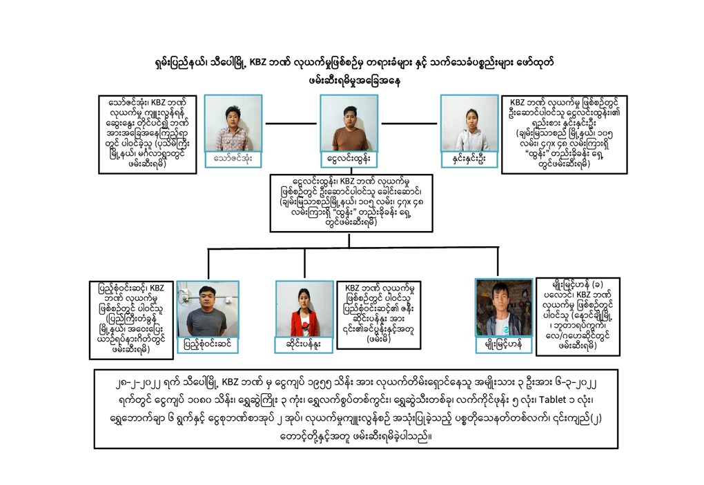 ၂၀၂၁ ခုနှစ်၊ စက်တင်ဘာလ ၃ ရက်နေ့ မွန်းလွဲ ၂ နာရီအချိန်တွင် ရှမ်းပြည်နယ် (မြောက်ပိုင်း)၊ ကျောက်မဲမြို့၊ အမှတ်(၂)ရပ်ကွက်ရှိ ကမ္ဘောဇဘဏ်ခွဲအမှတ်(၁၀၆)ရှေ့သို့ မော်တော်ယာဉ် ၁ စီးဖြင့် အမျိုးသား ၃ ဦး(စိစစ်ဆဲ) ရောက်ရှိလာကာ ၁ ဦးမှာ ကားအတွင်း စောင့်နေခဲ့ပြီး ကျန်အမျိုးသား ၂ ဦးအနက် ၁ ဦးမှာ သေနတ်ကိုင်ဆောင်၍ ဘဏ်အတွင်းဝင်ရောက်ကာ ငွေကျပ် သိန်း ၁၀၀၀ ခန့်အား လုယက်ယူဆောင် ထွက်ပြေးခဲ့သည့်ဖြစ်စဉ်နှင့် ၂၀၂၂ ခုနှစ်၊ ဖေဖော်ဝါရီလ ၂၈ ရက်နေ့ မွန်းလွဲ၂ နာရီ ၄၀ မိနစ်အချိန်တွင် သီပေါမြို့နယ်၊ ပန်းတိမ်မြောက်ရပ်ကွက်ရှိ ကမ္ဘောဇဘဏ်သို့ ယာဉ်အမှတ် YGN 3E/ 4798 နံပါတ်တပ်ဆင်ထားသည့် TOYOTA GAIA အမျိုးအစား အဖြူရောင် ယာဉ်ဖြင့် အမျိုးသား ၃ ဦး(စိစစ်ဆဲ)ရောက်ရှိလာပြီး ဘဏ်အတွင်းသို့ဝင်ရောက်လာကာ အမျိုးသား ၁ ဦးက ၎င်းလက်အတွင်း အသင့်ကိုင်ဆောင်လာသည့် ပစ္စတိုသေနတ်ဖြင့် ဘဏ်လုံခြုံရေးနှင့် ဘဏ်အတွင်းငွေထုတ်ရန် ရောက်ရှိနေသူများအား သေနတ်ပြခြိမ်းခြောက်ကာ ကြမ်းပြင်ပေါ်သို့ မှောက်ခိုင်းထား၍ ကျန်အမျိုးသား ၂ ဦးက ဓားများ ကိုယ်စီကိုင်ဆောင်ကာ ဘဏ်ငွေသွင်းကောင်တာ စားပွဲပေါ်ရှိ ငွေကျပ် ၁၉၅၅ သိန်းအား အသင့်ယူဆောင်လာသည့် လက်ဆွဲဆာလာအိတ်အတွင်းထည့်၍ ငွေများအားယူဆောင်ကာ ကျောက်မဲမြို့ဘက်သို့ မော်တော်ယာဉ်ဖြင့် မောင်းနှင်ထွက်ပြေးသွားခဲ့သည့် ဖြစ်စဉ်များ ဖြစ်ပွားခဲ့သဖြင့် သက်ဆိုင်ရာ နယ်မြေရဲစခန်းများတွင် အမှုဖွင့်လှစ် စုံစမ်းစစ်ဆေးခဲ့ပါသည်။