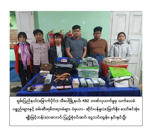 ရှမ်းပြည်နယ်(မြောက်ပိုင်း)၊ ကျောက်မဲမြို့နှင့် သီပေါမြို့နယ်တို့ရှိ ကမ္ဘောဇဘဏ်ခွဲ(၂)ခုအား သေနတ်ပြခြိမ်းခြောက်၍ လုယက်မှုကျူးလွန်ခဲ့သူ တရားခံများအား သက်သေခံပစ္စည်းများနှင့်အတူ ဖော်ထုတ်ဖမ်းဆီးရမိ