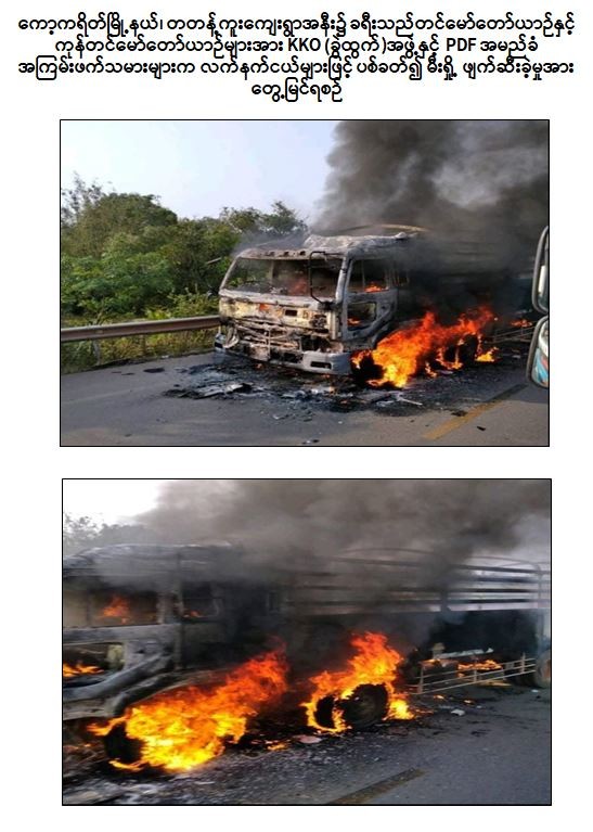 အလားတူ ဇန်နဝါရီလ ၂၇ ရက်နေ့ ည ၉ နာရီအချိန်ခန့်တွင် မြဝတီမှရန်ကုန်သို့ စားသောက်ကုန်နှင့် လူသုံးကုန်ပစ္စည်းများ သယ်ဆောင်လာသည့် ဦးဇော်ဇော်ဦး(ဘ) ဦးသန်းအောင် မောင်းနှင်ပြီး ဇနီး ဒေါ်ရှမ်းမ(ဘ) ဦးလှမြင့် လိုက်ပါစီးနင်းလာသော မော်တော်ယာဉ်သည် ကော့ကရိတ်မြို့နယ် ချောင်းတောင်ရွာ၏ အရှေ့တောင်ဘက် မီတာ ၈၀၀ ခန့်အကွာ သို့ရောက်ရှိစဉ် KKO(ခွဲထွက်) အဖွဲ့နှင့် PDF အမည်ခံအကြမ်းဖက် သမားများက ယာဉ်အားရပ်တန့်စေပြီး မော်တော်ယာဉ်အား ဓာတ်ဆီလောင်း၍ မီးရှို့ဖျက်ဆီးခဲ့သည်။