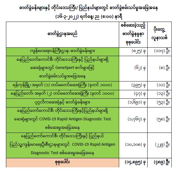 သို့ဖြစ်ပါ၍ ယနေ့အထိ ဓာတ်ခွဲနမူနာစုစုပေါင်း (၇,၄၃၇,၂၁၃) ခုအား စစ်ဆေးခဲ့ပြီး COVID-19 ဓာတ်ခွဲအတည်ပြုလူနာစုစုပေါင်း (၆၀၇,၃၉၉) ဦး ရှိပြီဖြစ်ပါသည်။