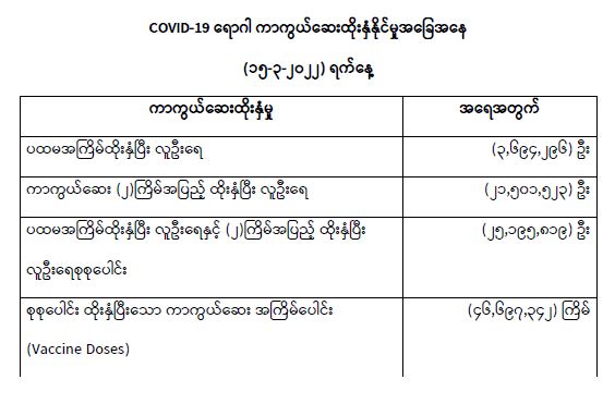COVID-19 ရောဂါ ကာကွယ်ထိန်းချုပ်ရေးအတွက် တိုင်းဒေသကြီး/ပြည်နယ်များတွင် COVID-19 ရောဂါကာကွယ်ဆေးကို ဦးတည်အုပ်စုများသတ်မှတ်၍ ထိုးနှံပေးလျက်ရှိရာ (၁၅-၃-၂၀၂၂) ရက်နေ့ အထိ လူဦးရေစုစုပေါင်း (25,195,819) ဦးအား ထိုးနှံပေးပြီးဖြစ်၍ ကာကွယ်ဆေးနှစ်ကြိမ် အပြည့် ထိုးနှံပြီးစီးသူ (21,501,523) ဦးနှင့် ပထမအကြိမ်ထိုးနှံပြီးစီးသူ (3,694,296) ဦး ရှိပြီဖြစ်ပါသည်။ သို့ဖြစ်ပါ၍ (၁၅-၃-၂၀၂၂) ရက်နေ့အထိ မြန်မာနိုင်ငံတွင် COVID-19 ရောဂါကာကွယ်ဆေး အကြိမ်ရေ စုစုပေါင်း (46,697,342) ကြိမ် ထိုးနှံပြီးဖြစ်ပါသည်။