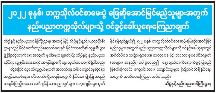 ၂၀၂၂ ခုနှစ်၊ တက္ကသိုလ်ဝင်စာမေးပွဲ ဖြေဆိုအောင်မြင်မည့်သူများအတွက် နည်းပညာတက္ကသိုလ်များသို့ ဝင်ခွင့်ခေါ်ယူရေးကြေညာချက်