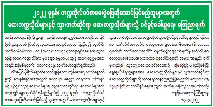 ၂၀၂၂ - ခုနှစ်၊ တက္ကသိုလ်ဝင်စာမေးပွဲ ဖြေဆိုအောင်မြင်မည့်သူများအတွက် ဆေးတက္ကသိုလ်များနှင့် သွားဘက်ဆိုင်ရာ ဆေးတက္ကသိုလ်များသို့ ဝင်ခွင့်ခေါ်ယူရေး ကြေညာချက်