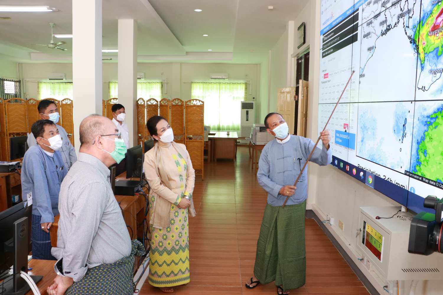 ဆက်လက်၍ ပြည်ထောင်စုဝန်ကြီးနှင့်အဖွဲ့သည် အရေးပေါ်အခြေအနေ စီမံခန့်ခွဲမှုဗဟိုဌာနသို့ သွားရောက်၍ ဘင်္ဂလားပင်လယ်အော်အတွင်း လက်ရှိဖြစ်ပေါ်နေသော မုန်တိုင်းငယ်နှင့်စပ်လျဉ်း၍ နောက်ဆုံးဖြစ်ပေါ်ပြောင်းလဲလာမှုအခြေအနေများ၊ အားကောင်းသည့် လေဖိအားနည်းရပ်ဝန်း အဖြစ် ရန်ကုန်တိုင်းဒေသကြီး၊ ကိုကိုးကျွန်းအနီးမှ ဖြတ်ကျော်ကာ ဧရာဝတီတိုင်းဒေသကြီးနှင့် ရခိုင်ပြည်နယ် တောင်ပိုင်းသို့ မုန်တိုင်းငယ်အဖြစ် ဖြတ်ကျော်ဝင်ရောက်နိုင်မှုများနှင့်ပတ်သက်၍ အရေးပေါ်အခြေအနေ စီမံခန့်ခွဲမှုဗဟိုဌာနက စောင့်ကြည့်လေ့လာပြီး အချိန်နှင့်တစ်ပြေးညီ သတင်း အချက်အလက်များ စုစည်းဆောင်ရွက်နေမှုကို ကြည့်ရှုစစ်ဆေးခဲ့ရာ အရေးပေါ်အခြေအနေ စီမံခန့်ခွဲမှုဗဟိုဌာန ခေတ္တတာဝန်ခံ ဌာနကြီးမှူး ဦးဝင်းထိန်ကျော်က ယခုဖြစ်ပေါ်နေသည့် မုန်တိုင်းငယ် နှင့်ပတ်သက်၍ မိုးလေဝသနှင့် ဇလဗေဒညွှန်ကြားမှုဦးစီးဌာန၏ ထုတ်ပြန်ချက်များ အပါအဝင် နိုင်ငံတကာမိုးလေဝသ Website များက လေ့လာတွေ့ရှိချက်များအရ မုန်တိုင်းဖြစ်ပေါ်နိုင်မှု အခြေအနေ၊ မိုးရရှိမှုအခြေအနေ၊ ဖြစ်ပေါ်နေသည့် မုန်တိုင်းငယ်၏ အဆင့်ဆင့် ပြောင်းလဲဖြစ်ပေါ်လာမှုများကို ရှင်းလင်းတင်ပြသည်။