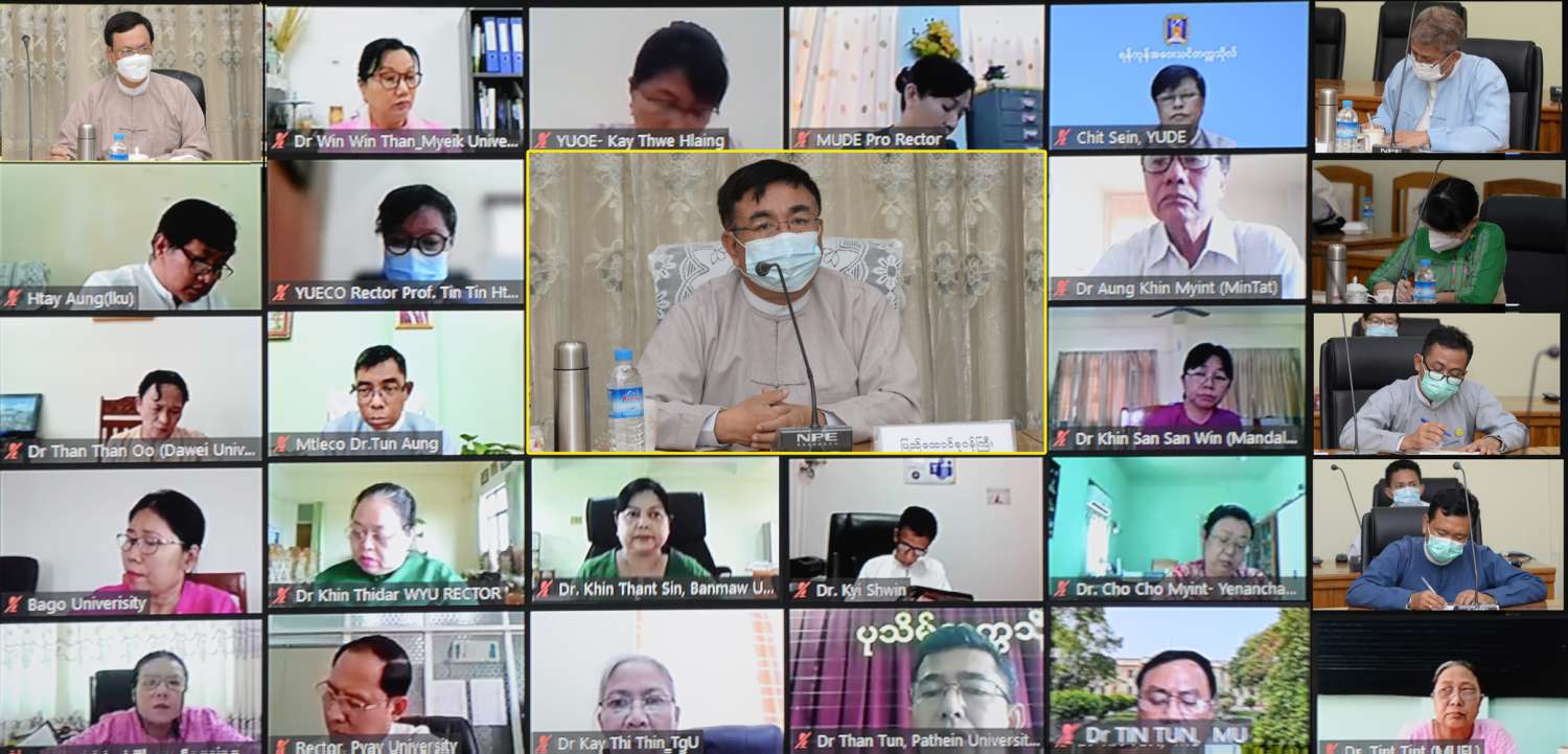 ပညာရေးဝန်ကြီးဌာန ပြည်ထောင်စုဝန်ကြီး ဒေါက်တာညွန့်ဖေသည် အဆင့် မြင့်ပညာဦးစီးဌာန တက္ကသိုလ်များမှ ပါမောက္ခချုပ်များအား ယနေ့မွန်းလွဲ ၂ နာရီတွင် ဗီဒီယိုကွန်ဖရင့်စနစ် တွေ့ဆုံသည်။