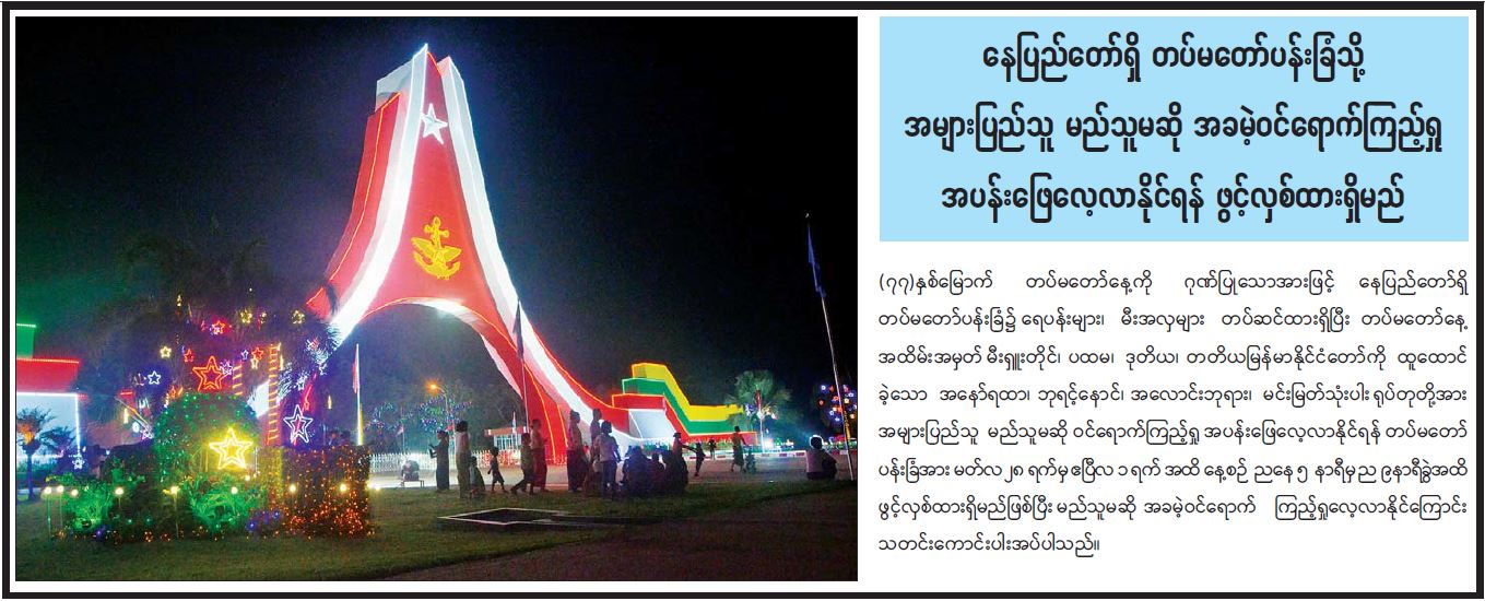နေပြည်တော်ရှိ တပ်မတော်ပန်းခြံသို့ အများပြည်သူ မည်သူမဆို အခမဲ့ဝင်ရောက်ကြည့်ရှု အပန်းဖြေလေ့လာနိုင်ရန် ဖွင့်လှစ်ထားရှိမည်