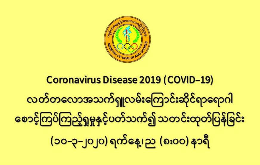 ၁။ ကျန်းမာရေးနှင့်အားကစားဝန်ကြီးဌာနသည် ကမ္ဘာ့နိုင်ငံများတွင် ကူးစက်ပျံ့နှံ့လျက်ရှိသည့် COVID-19 လတ်တလောအသက်ရှူလမ်းကြောင်းဆိုင်ရာ ရောဂါဖြစ်ပွားမှုဖြစ်စဉ်နှင့်ပတ်သက်၍ ရောဂါစောင့်ကြပ်ကြည့်ရှုခြင်း လုပ်ငန်းများအား အပြည်ပြည်ဆိုင်ရာ ဝင်ပေါက်၊ ထွက်ပေါက်ဂိတ် များတွင်လည်းကောင်း၊ ဆေးရုံအခြေပြုအဖြစ်လည်းကောင်း၊ ပြည်သူလူထုအခြေပြု စောင့်ကြပ် ကြည့်ရှုခြင်းလုပ်ငန်းများဖြင့်လည်းကောင်း၊ ပုဂ္ဂလိကဆေးရုံများနှင့် ပူးပေါင်း၍လည်းကောင်း ဆောင်ရွက်လျက်ရှိပါသည်။