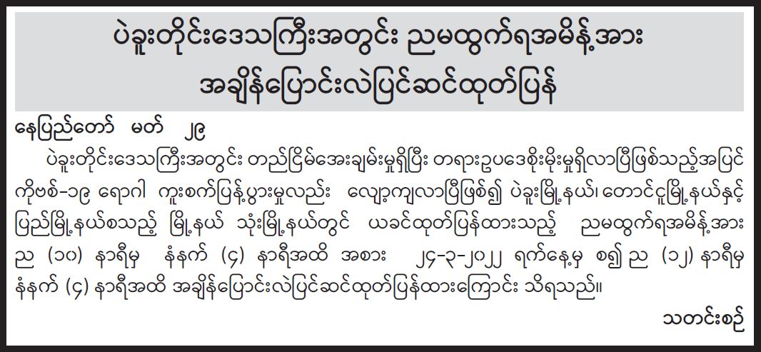 ပဲခူးတိုင်းဒေသကြီးအတွင်း ညမထွက်ရအမိန့်အား အချိန်ပြောင်းလဲပြင်ဆင်ထုတ်ပြန်