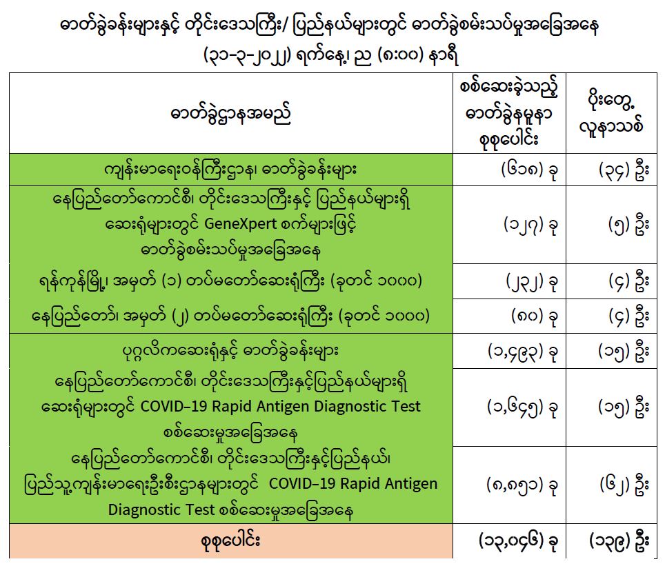 သို့ဖြစ်ပါ၍ ယနေ့အထိ ဓာတ်ခွဲနမူနာစုစုပေါင်း(၇,၆၅၆,၅၃၇) ခုအားစစ်ဆေးခဲ့ပြီး COVID-19 ဓာတ်ခွဲအတည်ပြုလူနာ စုစုပေါင်း (၆၁၁,၅၈၇) ဦး ရှိပြီ ဖြစ်ပါသည်။