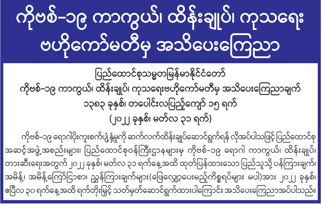 ကိုဗစ်-၁၉ ကာကွယ်၊ ထိန်းချုပ်၊ ကုသရေး ဗဟိုကော်မတီမှ အသိပေးကြေညာ