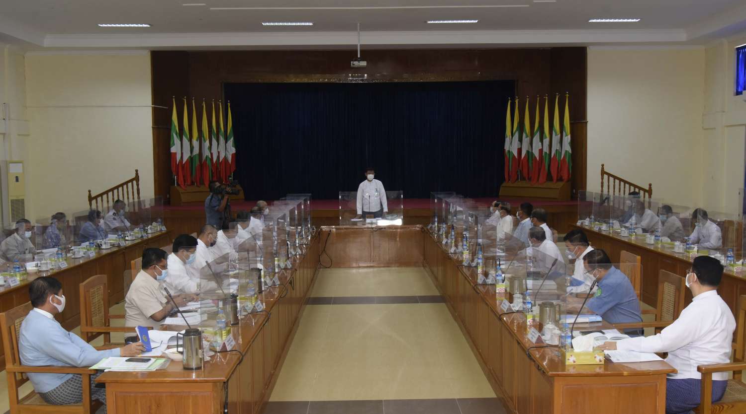 အစည်းအဝေးတွင် တိုင်းရင်းသားရေးရာ၊ ပြည်သူ့ရေးရာစီမံခန့်ခွဲမှုနှင့် ဝန်ဆောင်မှုရေး ရာကော်မတီဥက္ကဋ္ဌ နိုင်ငံတော်စီမံအုပ်ချုပ်ရေးကောင်စီဝင် ကာကွယ်ရေးဝန်ကြီးဌာန ပြည် ထောင်စုဝန်ကြီး ဗိုလ်ချုပ်ကြီးမြထွန်းဦးက မကြာမီ သင်္ကြန်ကာလ ရောက်ရှိမည်ဖြစ်ပြီး သင်္ကြန်ပွဲတော်ကို သတ်မှတ်ထားသည့် ကိုဗစ်-၁၉ စည်ကမ်း ချက်များနှင့်အညီ ခွင့်ပြုထား ရှိပြီး ဖြစ်သဖြင့် ဝန်ကြီးဌာနများအနေဖြင့်လည်း စနစ်တကျလိုက်နာ ဆောင်ရွက်သွားရန်လို အပ်ပါကြောင်း။