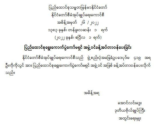 ပုံနှိပ်ခြင်းနှင့်ထုတ်ဝေခြင်းလုပ်ငန်းဥပဒေနှင့်အညီ စာအုပ်စာစောင်များ ပေးအပ်ရန် အသိပေးကြေညာချက်