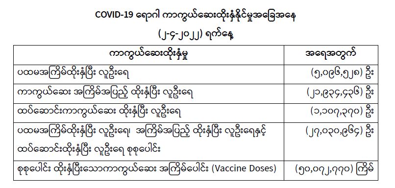 COVID-19 ရောဂါ ကာကွယ်ထိန်းချုပ်ရေးအတွက် တိုင်းဒေသကြီး/ပြည်နယ်များတွင် COVID-19 ရောဂါ ကာကွယ်ဆေးကို ဦးတည်အုပ်စုများ သတ်မှတ်၍ ထိုးနှံပေးလျက်ရှိရာ (၂-၄-၂၀၂၂) ရက်နေ့အထိ လူဦးရေ စုစုပေါင်း (27,030,964) ဦးအား ထိုးနှံပေးပြီးဖြစ်၍ ပထမအကြိမ် ထိုးနှံပြီးစီးသူ (5,096,528) ဦး၊ ကာကွယ်ဆေး အကြိမ်ပြည့်ထိုးနှံပြီးစီးသူ (21,934,436) ဦးနှင့် ထပ်ဆောင်းကာကွယ်ဆေး ထိုးနှံပြီးစီးသူ (1,107,370) ဦး ရှိပြီဖြစ်ပါသည်။ သို့ဖြစ်ပါ၍ (၂-၄-၂၀၂၂) ရက်နေ့အထိ မြန်မာနိုင်ငံတွင် COVID-19 ရောဂါကာကွယ်ဆေး အကြိမ်ရေ စုစုပေါင်း (50,072,770) ကြိမ် ထိုးနှံပြီးဖြစ်ပါသည်။