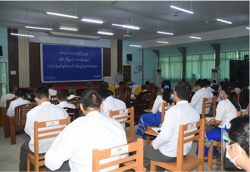 အလုပ်သမားဝန်ကြီးဌာန၏ ခရိုင်/ မြို့နယ်တာဝန်ခံများအား လုပ်ငန်းစွမ်းဆောင်ရည်မြှင့် တင်နိုင်ရေးအတွက် ရန်ကုန်တိုင်းဒေသကြီး၊ ဒဂုံမြို့သစ် (မြောက်ပိုင်း)မြို့နယ်ရှိ ကျွမ်းကျင်မှု လေ့ကျင့်ရေးသင်တန်းကျောင်း ပင်လုံခန်းမ၌ ဧပြီ ၄ ရက်မှ ၇ ရက်အထိ ဖွင့်လှစ်မည့် လုပ်ငန်းခွင် မွမ်းမံသင်တန်းဖွင့်ပွဲ အခမ်းအနားကို ယနေ့နံနက်ပိုင်းတွင် အဆိုပါခန်းမ၌ ကျင်းပသည်။