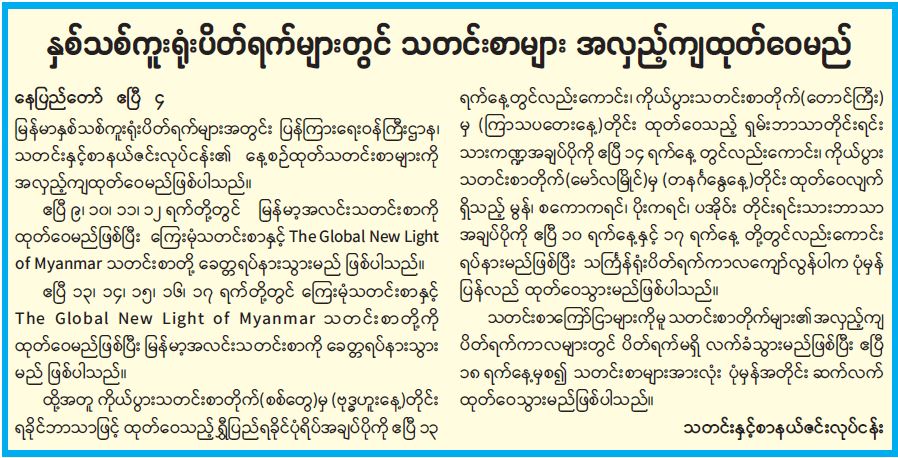 နှစ်သစ်ကူးရုံးပိတ်ရက်များတွင် သတင်းစာများ အလှည့်ကျထုတ်ဝေမည်