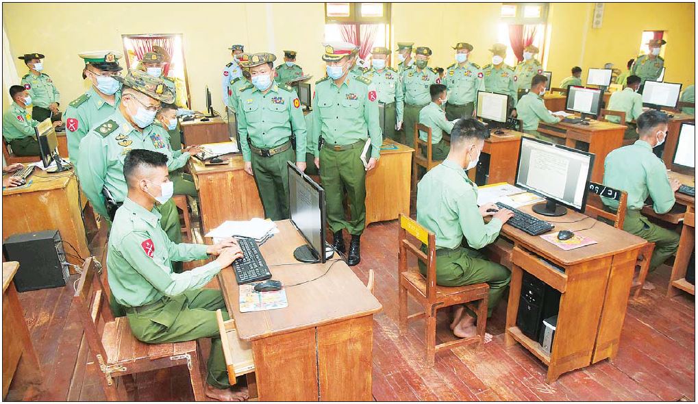 ဦးစွာ နိုင်ငံတော်စီမံအုပ်ချုပ်ရေးကောင်စီ ဒုတိယဥက္ကဋ္ဌ ဒုတိယတပ်မတော် ကာကွယ်ရေးဦးစီးချုပ်၊ ကာကွယ်ရေးဦးစီချုပ်(ကြည်း)သည် အဖွဲ့ဝင်များနှင့်အတူ တပ်မတော်(ကြည်း)အရာခံနှင့် အကြပ်ကြီး သင်ကျောင်းသို့ သွားရောက်၍ မြဝတီစာသင်ဆောင်၌ ကွန်ပျူတာဒီပလိုမာ တပ်ကြပ်ကြီး/စာရေး သင်တန်းသားများအား သင်ခန်းစာများအလိုက် စာတွေ့လက်တွေ့ လေ့ကျင့်သင်ကြားပေးနေမှုများနှင့် သင်တန်းခန်းမဆောင်များအား လိုက်လံကြည့်ရှုစစ်ဆေးပြီး လိုအပ်သည်များ မှာကြားသည်။