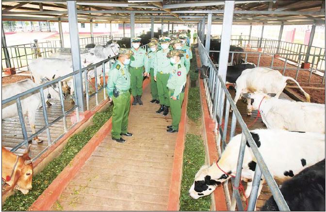 ထို့နောက် နိုင်ငံတော်စီမံအုပ်ချုပ်ရေးကောင်စီ ဒုတိယဥက္ကဋ္ဌ ဒုတိယတပ်မတော်ကာကွယ်ရေး ဦးစီးချုပ် ကာကွယ်ရေးဦးစီးချုပ်(ကြည်း) နှင့် အဖွဲ့ဝင်များသည် တိရစ္ဆာန်မွေးမြူရေးနှင့် လေ့ကျင့်ရေးတပ်ရင်းရှိ စံပြစိုက်ပျိုးမွေးမြူရေးဇုန် စုစုပေါင်း ၅၅ ဧက တည်ဆောက်ထားရှိမှု အခြေအနေ၊ ရာသီသီးနှံနှင့် မြေအစားထိုးသီးနှံ စိုက်ပျိုးထားရှိမှု၊ Green House အတွင်း စိုက်ပျိုးထားရှိမှုနှင့် ကျောက်စိမ်း တစ်သျှူးငှက်ပျော (သီးမွှေး) စိုက်ပျိုး ထားရှိမှု၊ DYL မျိုးမြင့် သားပေါက်ဝက်များနှင့် မြေစိုက်ရေခံ အဆောက်အဦနှင့် လေလုံအအေးပေး အဆောက်အဦအတွင်း ဥစားကြက်များ မွေးမြူထား ရှိမှု၊ နို့စားနွားနှင့် အသားတိုးနွားများ မွေးမြူထားရှိမှု၊ လား၊ မြည်းမွေးမြူထားရှိမှုတို့ကို လှည့်လည် ကြည့်ရှုစစ်ဆေးပြီး တာဝန်ရှိသူများအား စိုက်ပျိုး မွေးမြူရေးလုပ်ငန်းများ ဆောင်ရွက်ရာတွင် အမှန်တကယ် အောင်မြင်ဖြစ်ထွန်းအောင် လုပ်ဆောင်ကြရန်၊ နိုင်ငံတော်စီမံအုပ်ချုပ်ရေး ကောင်စီဥက္ကဋ္ဌ နိုင်ငံတော်ဝန်ကြီးချုပ် လမ်းညွှန်ချက်အတိုင်း စိုက်ပျိုးမွေးမြူရေးလုပ်ငန်းများမှ ထွက်ရှိသည့် ထုတ် ကုန်အသား၊ ငါး၊ အသီးအရွက်များအား တပ်ရင်း/တပ်ဖွဲ့များရှိ အရာရှိ၊ စစ်သည်၊ မိသားစုများ ပြင်ပ ပေါက်ဈေးထက် သက်သာသောဈေးနှုန်းများဖြင့် လုံလောက်ဖူလုံစွာ ရရှိနိုင်ရန်နှင့် ပိုလျှံပါက နိုင်ငံ့ဝန်ထမ်းများနှင့် ဒေသခံပြည်သူများ၏ သက်သာ ချောင်ချိရေးအတွက် သက်သာသော ဈေးနှုန်းများဖြင့် ရောင်းချရန်၊ စံပြစိုက်ပျိုးမွေးမြူရေးဇုန် ဖြစ်သည်နှင့်အညီ ဒေသတွင်းစံပြဖြစ်အောင်နှင့် အောင်မြင်ဖြစ်ထွန်းအောင် ရည်မှန်းချက်ထား၍ မရပ်မနား ကြိုးပမ်းဆောင်ရွက်သွားရန် မှာကြားခဲ့ကြောင်း သတင်းရရှိသည်။