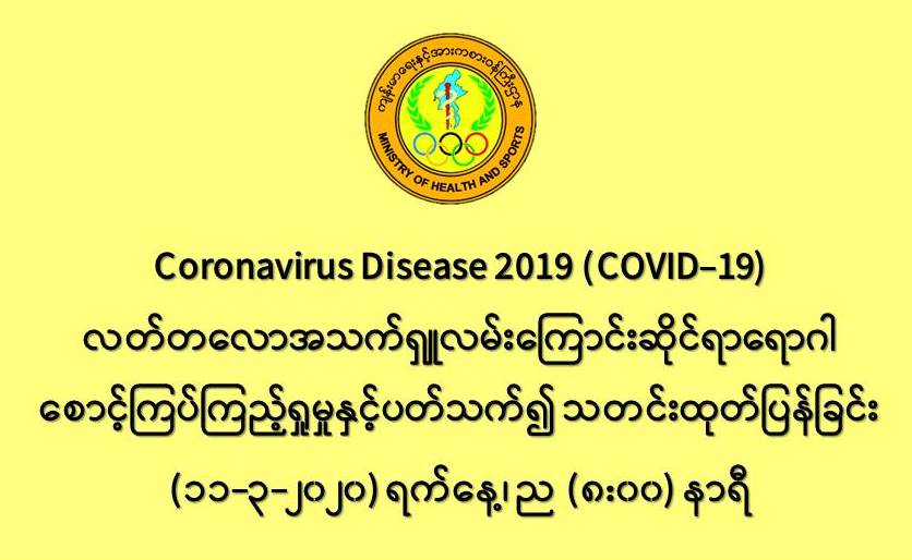 ၁။ ကျန်းမာရေးနှင့်အားကစားဝန်ကြီးဌာနသည် ကမ္ဘာ့နိုင်ငံများတွင် ကူးစက်ပျံ့နှံ့လျက်ရှိသည့် COVID-19 လတ်တလောအသက်ရှူလမ်းကြောင်းဆိုင်ရာ ရောဂါဖြစ်ပွားမှုဖြစ်စဉ်နှင့်ပတ်သက်၍ ရောဂါစောင့်ကြပ်ကြည့်ရှုခြင်း လုပ်ငန်းများအား အပြည်ပြည်ဆိုင်ရာ ဝင်ပေါက်၊ ထွက်ပေါက်ဂိတ် များတွင်လည်းကောင်း၊ ဆေးရုံအခြေပြုအဖြစ်လည်းကောင်း၊ ပြည်သူလူထုအခြေပြု စောင့်ကြပ် ကြည့်ရှုခြင်းလုပ်ငန်းများဖြင့်လည်းကောင်း၊ ပုဂ္ဂလိကဆေးရုံများနှင့် ပူးပေါင်း၍လည်းကောင်း ဆောင်ရွက်လျက်ရှိပါသည်။