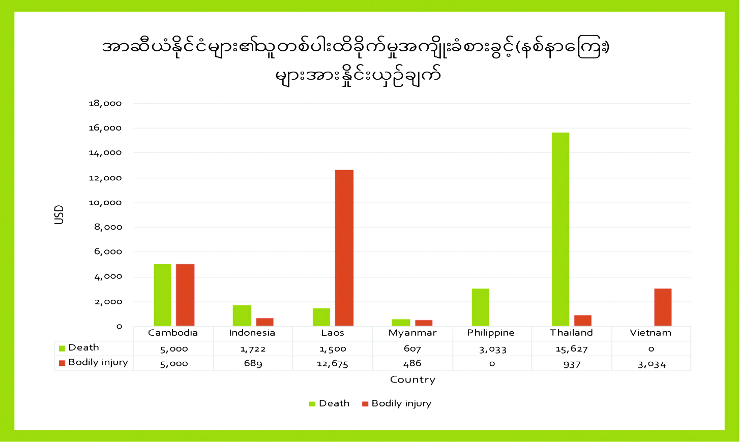 လက်ရှိ အာဆီယံနိုင်ငံများ၏ သူတစ်ပါးထိခိုက်မှုအာမခံ နစ်နာကြေးပေးချေမှုနှုန်းထားနှင့် ကိုက်ညီ စေရန်နှင့် စက်တပ်ယာဉ်ထိခိုက်မှုကြောင့် နစ်နာခဲ့ရသော ပြည်သူများအား တစ်စုံတစ်ရာ အထောက်အပံ့ ရရှိစေနိုင်ရန်အတွက် မြန်မာ့အာမခံလုပ်ငန်းအနေဖြင့် အကျိုးခံစားခွင့်(နစ်နာကြေး) နှုန်းထားများကို ဘဏ္ဍာရေးနှစ် အစဖြစ်သော (၁-၄-၂၀၂၂)ရက်နေ့မှစတင်ပြီး အောက်ပါအတိုင်း ပြောင်းလဲပြင်ဆင်ပေးလျော် သွားမည် ဖြစ်ပါသည်။