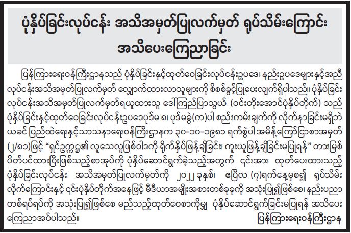 ပုံနှိပ်ခြင်းလုပ်ငန်း အသိအမှတ်ပြုလက်မှတ် ရုပ်သိမ်းကြောင်း အသိပေးကြေညာခြင်း 04/09/2022 ပုံနှိပ်ခြင်းလုပ်ငန်း အသိအမှတ်ပြုလက်မှတ် ရုပ်သိမ်းကြောင်း အသိပေးကြေညာခြင်း