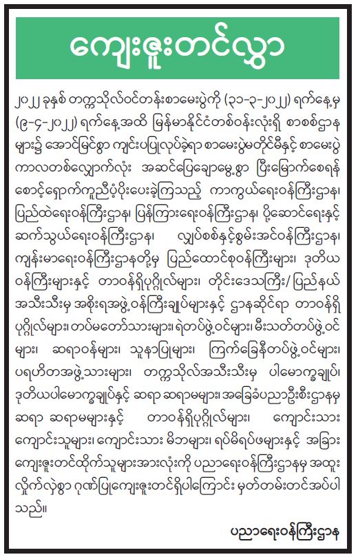 ပုံနှိပ်ခြင်းနှင့်ထုတ်ဝေခြင်းလုပ်ငန်းဥပဒေနှင့်အညီ စာအုပ်စာစောင်များ ပေးအပ်ရန် အသိပေးကြေညာချက်