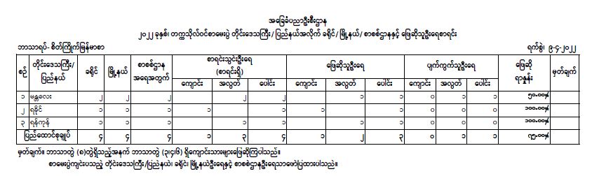ယခုနှစ်တွင် ပြည်တွင်းစာစစ်ဌာန၄ ခု ဖွင့်လှစ်ဖြေဆိုခဲ့ရာ စိတ်ကြိုက်မြန်မာစာ စာမေးပွဲဖြေဆိုရန် စာရင်းပေးသွင်းသူဦးရေ စုစုပေါင်း ၄ ဦးရှိပြီး စာမေးပွဲ နဝမနေ့ စိတ်ကြိုက်မြန်မာစာ လာရောက်ဖြေဆိုသူ စုစုပေါင်း ၃ ဦးရှိကာ ဖြေဆိုသူ ရာခိုင်နှုန်း ၇၅ ရာခိုင်နှုန်းရှိကြောင်း ပညာရေးဝန်ကြီးဌာနမှ သိရသည်။