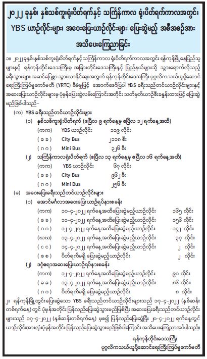 ၂၀၂၂ ခုနှစ်၊ နှစ်သစ်ကူးရုံးပိတ်ရက်နှင့် သင်္ကြန်ကာလ ရုံးပိတ်ရက်ကာလအတွင်း YBS ယာဉ်လိုင်း များ၊ အဝေးပြေးယာဉ်လိုင်းများ ပြေးဆွဲမည့် အစီအစဉ်အား အသိပေးကြေညာခြင်း 04/10/2022