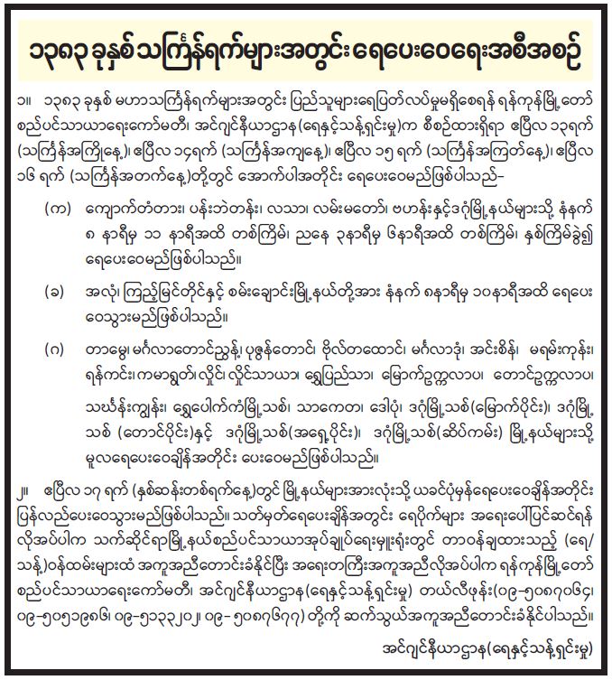 ရန်ကုန်မြို့နှင့် မန္တလေးမြို့အတွက် ရည်ညွှန်းလက်ကားဈေးနှုန်းများနှင့် ပြည်ထောင်စုနယ်မြေ နေပြည်တော်၊ တိုင်းဒေသကြီး/ပြည်နယ် မြို့တော်များအတွက် ရည်ညွှန်းလက်လီဈေးနှုန်းများ