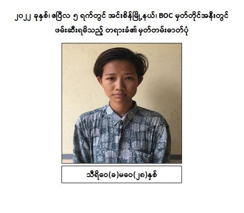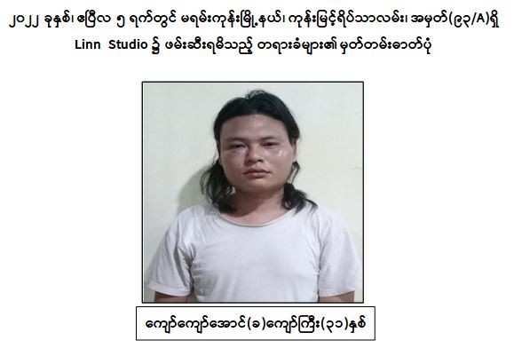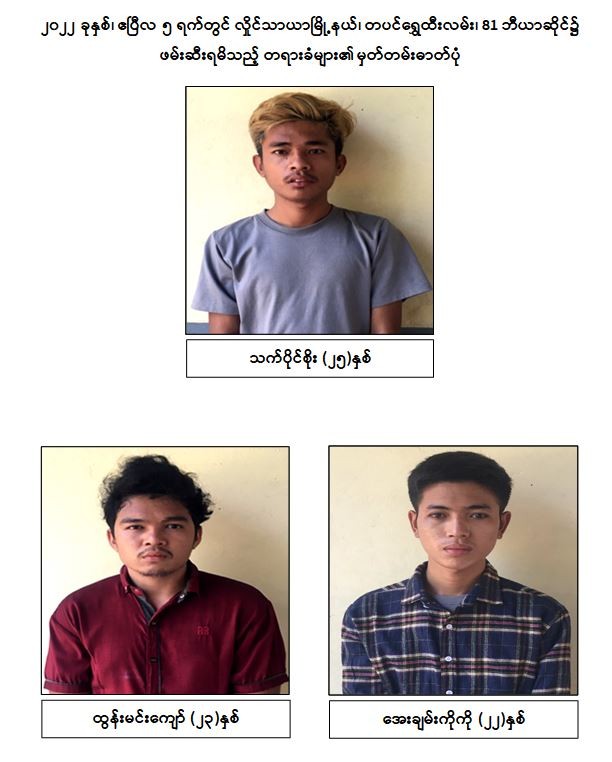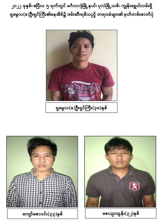သို့ဖြစ်ပါ၍ ဖမ်းဆီးရမိတရားခံများအား ဥပဒေအရထိရောက်စွာ အရေးယူနိုင်ရေး ဆက်လက်ဆောင်ရွက်သွားမည်ဖြစ်ပြီး အကြမ်းဖက်မှုဆောင်ရွက်နေသူများအား ပြည်သူတစ်ရပ်လုံးက ဝိုင်းဝန်း ကာကွယ်တိုက်ဖျက်ကြရန်နှင့် ပြစ်မှုကျူးလွန်ရာတွင် ပါဝင်ပတ်သက်သူများ၊ နောက်ကွယ်မှ ထောက်ပံ့ပေးလျက်ရှိသော ဆက်စပ်တရားခံများအား အမြန်ဆုံးဖမ်းဆီးရမိရေးအတွက် ၎င်းတို့ပုန်းခိုရာ နေရာများ၊ လှုပ်ရှားသွားလာနေထိုင်မှု သတင်းများရရှိပါက သက်ဆိုင်ရာသို့ လျှို့ဝှက်စွာသတင်းပေး တိုင်ကြားနိုင်ပါကြောင်း၊ သတင်းပေးသူနှင့် ဖမ်းဆီးပေးသူများအား ထိုက်တန်စွာ လျှို့ဝှက်၍ ဆုငွေများ ချီးမြှင့်ပေးမည်ဖြစ်ကြောင်းနှင့် မြို့ရွာများအမြန်ဆုံး အေးချမ်းတည်ငြိမ်ရေးအတွက် ပြည်သူတစ်ရပ်လုံး ပူးပေါင်းပါဝင်ကြိုးပမ်းဆောင်ရွက်နိုင်ပါရန် မေတ္တာရပ်ခံအပ်ပါကြောင်း အသိပေးသတင်းထုတ်ပြန်အပ် ပါသည်။