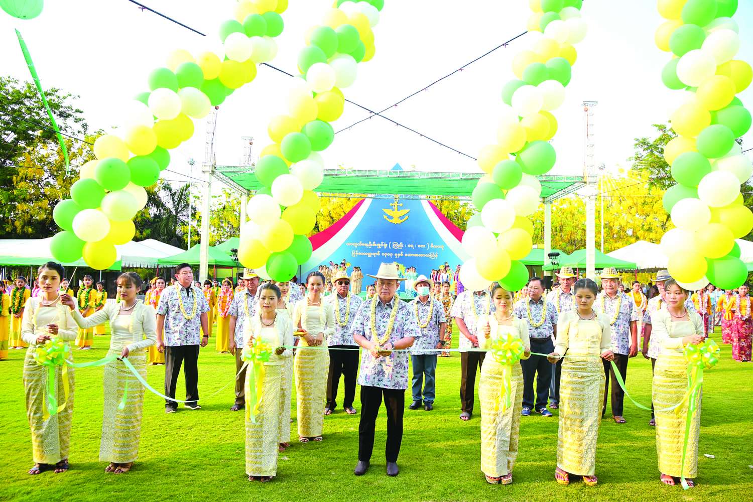 ယင်းနောက် ယိမ်းအဖွဲ့သမီးပျိုများက “မင်္ဂလာရှိသောသင်္ကြန်” သီချင်းဖြင့် ကပြဖျော်ဖြေကြရာ ဖွင့်ပွဲအခမ်းအနားတက်ရောက်လာကြသူများက ယိမ်းအဖွဲ့များနှင့် ဧည့်ပရိသတ်များကို အောင်သပြေ ခက်ဖြင့် အတာရေပက်ဖျန်းပေးကြသည်။