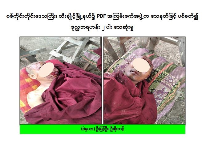 အလားတူ ယနေ့နံနက် ၉ နာရီခန့်တွင် ထီးချိုင့်မြို့နယ်၊ တုံလုံကျေးရွာရှိ ရွှေသုဝဏ် ဘုန်းကြီးကျောင်း၌ ဒုလ္လဘရဟန်း ၂ ပါးအား PDF အမည်ခံ အကြမ်းဖက်အဖွဲ့က သေနတ်ဖြင့် ပစ်ခတ်သတ်ဖြတ်ခဲ့ကြောင်း သတင်းအရ လုံခြုံရေးတပ်ဖွဲ့ဝင်များက သွားရောက်စစ်ဆေးခဲ့ရာ အဆိုပါဘုန်းတော်ကြီးကျောင်းတွင် ဒုလ္လဘရဟန်းဝတ်နေသူ တုံလုံကျေးရွာနေ ဦးမြင့်ဦး(၅၃)နှစ် (ဘ)ဦးပြည်ကျော်နှင့် ဦးစိုးတင့်(၅၃)နှစ် (ဘ)ဦးမောင်ဝင်းတို့သည် ကျောင်းအတွင်း ရှိနေစဉ်သေနတ်များ ကိုယ်စီကိုင်ဆောင်ထားသည့် PDF အကြမ်းဖက်အဖွဲ့ အင်အား ၁၀ ဦးခန့်က ဆိုင်ကယ် ၅ စီးဖြင့် ရောက်ရှိလာပြီး ၎င်းတို့ ၂ ဦးအား ဘုန်တော်ကြီးကျောင်းအောက်သို့ ဖမ်းဆီးခေါ်ဆောင်၍ ဦးမြင့်ဦးအား ကျောင်းလှေကားရင်း၌ လည်းကောင်း၊ ဦးစိုးတင့်အား ဘုန်းကြီးကျောင်းမုခ်ဝတွင်သေနတ်ဖြင့် ပစ်ခတ်သတ်ဖြတ်ခဲ့သဖြင့် ဦးမြင့်ဦးနှင့် ဦးစိုးတင့်တို့တွင် သေနတ်ထိမှန်ဒဏ်ရာများရရှိကာ အခင်းဖြစ်နေရာ၌ သေဆုံးသွားခဲ့ ကြောင်းသိရှိရသည်။