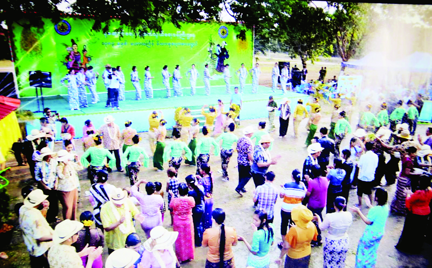 ဝန်ကြီးဌာန ရေကစားမဏ္ဍပ်တွင် ဝန်ကြီးဌာန လက်အောက်ခံဌာနအဖွဲ့အစည်းများမှ ဝန်ထမ်းအမျိုးသမီးငယ်များ၏ ယိမ်းအဖွဲ့များက သင်္ကြန်ယိမ်းအကများဖြင့် ဖျော်ဖြေကြ ရာ ပြည်ထောင်စုဝန်ကြီးနှင့်ဇနီးတို့က ယိမ်းအဖွဲ့များအား ဂုဏ်ပြုဆုငွေများ ချီးမြှင့်သည်။