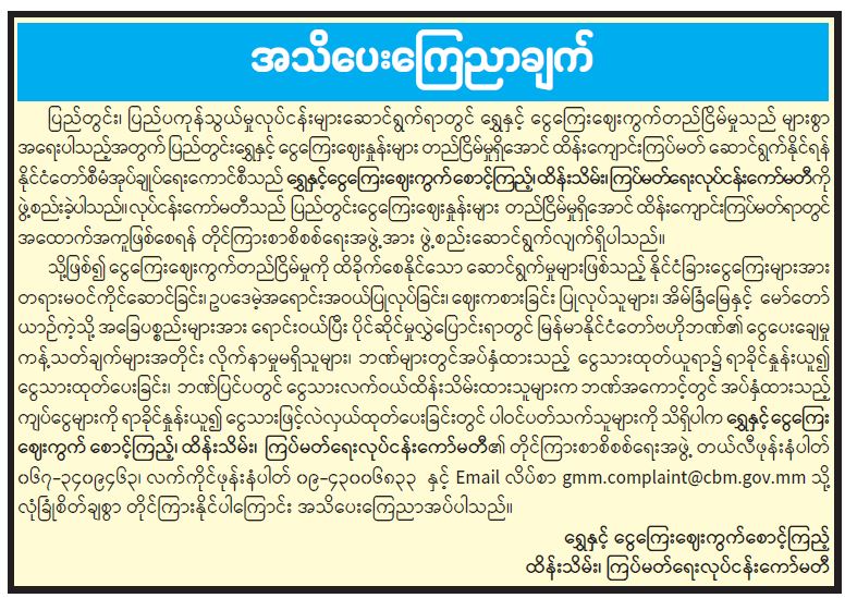 မြန်မာနိုင်ငံသတင်းမီဒီယာကောင်စီသို့ ဆက်သွယ်တိုင်ကြားနိုင်ပါသည်