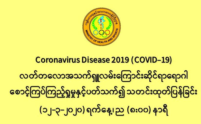 ၁။ ကျန်းမာရေးနှင့်အားကစားဝန်ကြီးဌာနသည် ကမ္ဘာ့နိုင်ငံများတွင် ကူးစက်ပျံ့နှံ့လျက်ရှိသည့် COVID-19 လတ်တလောအသက်ရှူလမ်းကြောင်းဆိုင်ရာ ရောဂါဖြစ်ပွားမှုဖြစ်စဉ်နှင့်ပတ်သက်၍ ရောဂါစောင့်ကြပ်ကြည့်ရှုခြင်း လုပ်ငန်းများအား အပြည်ပြည်ဆိုင်ရာ ဝင်ပေါက်၊ ထွက်ပေါက်ဂိတ် များတွင်လည်းကောင်း၊ ဆေးရုံအခြေပြုအဖြစ်လည်းကောင်း၊ ပြည်သူလူထုအခြေပြု စောင့်ကြပ် ကြည့်ရှုခြင်းလုပ်ငန်းများဖြင့်လည်းကောင်း၊ ပုဂ္ဂလိကဆေးရုံများနှင့် ပူးပေါင်း၍လည်းကောင်း ဆောင်ရွက်လျက်ရှိပါသည်။