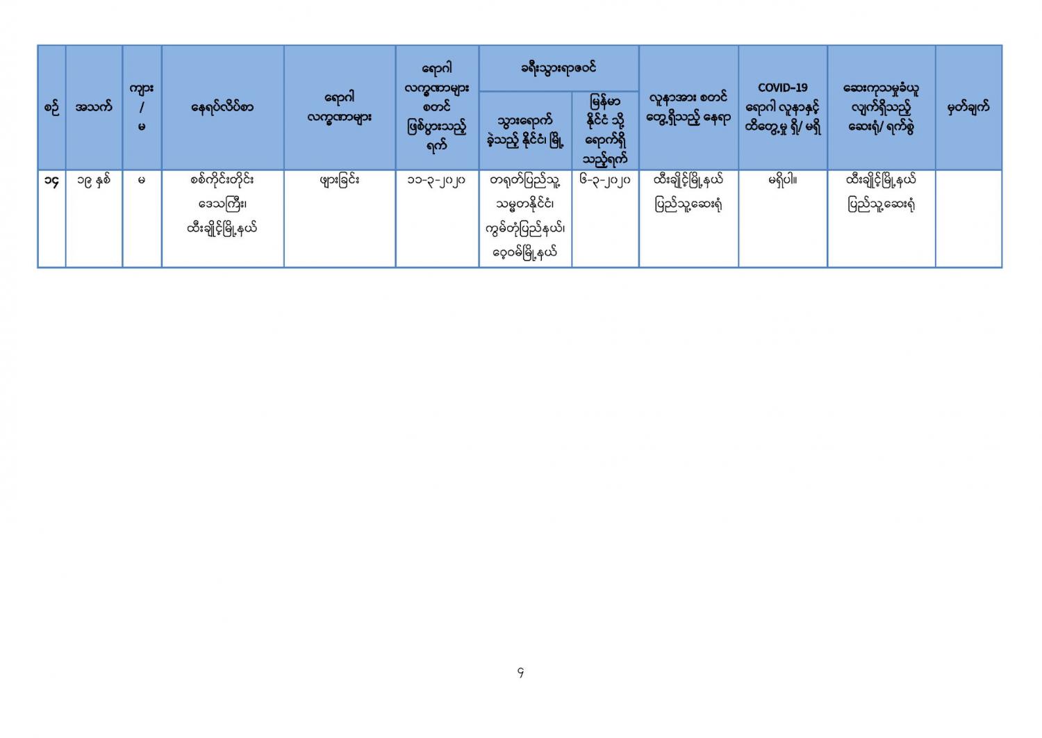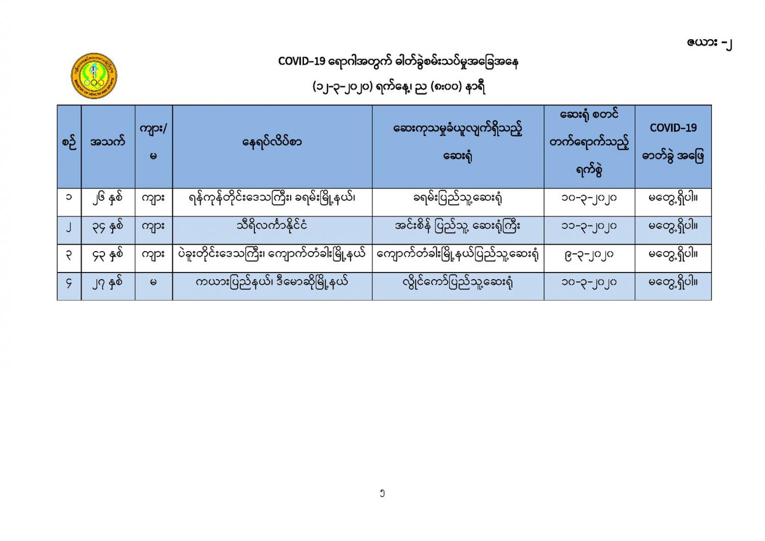 ၄။ ဆေးရုံများတွင်ထားရှိ၍ အသွားအလာကန့်သတ်မှု (Hospital Quarantine) ပြုလုပ်ထား သော တောင်ဥက္ကလာပ အမျိုးသမီးနှင့်ကလေးဆေးရုံကြီးမှ မြန်မာနိုင်ငံသား (၈) ဦးနှင့် မကွေးတိုင်း ဒေသကြီး၊ အောင်လံမြို့နယ်၊ ရွှေပန်းတောတိုက်နယ်ဆေးရုံမှ မြန်မာနိုင်ငံသား (၁) ဦး၊ စုစုပေါင်း (၉) ဦးတို့၏ ဓာတ်ခွဲအဖြေများတွင် Coronavirus Disease 2019 (COVID-19) ဗိုင်းရပ်စ် ရောဂါပိုး မရှိပါကြောင်း (မရှိကြောင်း) စစ်ဆေးသိရှိရပါသည်။