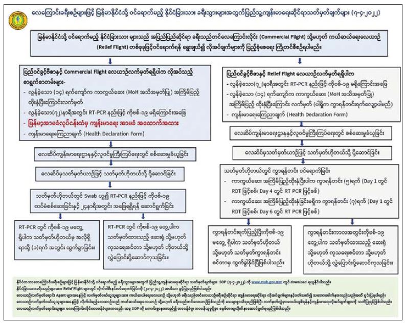 နိုင်ငံတကာလေကြောင်းခရီးစဉ်များကို ဧပြီ ၁၇ ရက်မှ စတင်ကာ ပြန်လည်ဖွင့်လှစ်ပေး ခဲ့သည့်အတွက် နိုင်ငံတကာလေကြောင်းခရီးစဉ် များဖြင့် မြန်မာနိုင်ငံသို့ ဝင်ရောက်လာမည့် မြန်မာနိုင်ငံသားနှင့် နိုင်ငံခြားသားခရီးသွားများအတွက် ပြည်သူ့ကျန်းမာရေးဆိုင်ရာ သတ်မှတ်ချက်များကို ကျန်းမာရေးဝန်ကြီးဌာနက ဧပြီ ၇ ရက်တွင် ထုတ်ပြန်ခဲ့သည်။