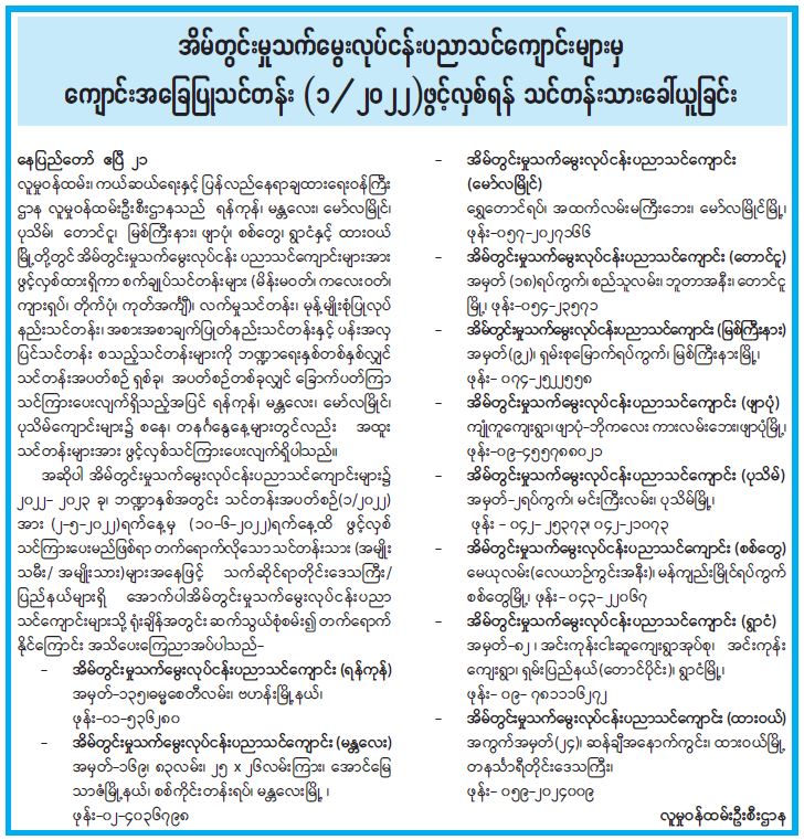 အိမ်တွင်းမှုသက်မွေးလုပ်ငန်း ပညာသင်ကျောင်းများမှ ကျောင်းအခြေပြုသင်တန်း (၁/၂၀၂၂) ဖွင့်လှစ်ရန် သင်တန်းသားခေါ်ယူခြင်း 04/22/2022