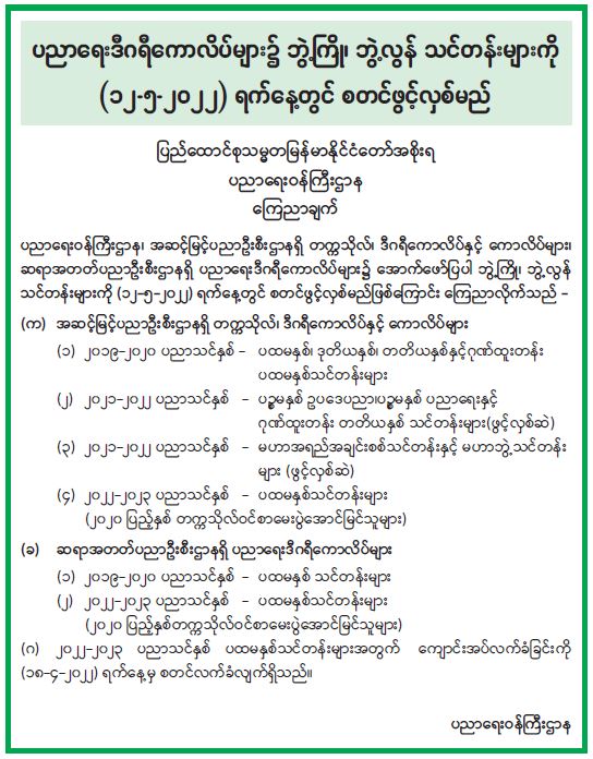 ပညာရေးဒီဂရီကောလိပ်များ၌ ဘွဲ့ကြို၊ ဘွဲ့လွန် သင်တန်းများကို (၁၂-၅-၂၀၂၂) ရက်နေ့တွင် စတင်ဖွင့်လှစ်မည် 04/22/2022