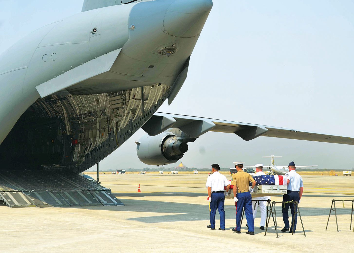 မြန်မာနိုင်ငံ စစ်ကိုင်းတိုင်းဒေသကြီး ဆားလင်းကြီးဒေသတစ်ဝိုက်တွင် မကြာသေးမီက ရှာဖွေတွေ့ရှိခဲ့သော ဒုတိယကမ္ဘာစစ်အတွင်းက ကျဆုံးပျောက်ဆုံး ကျန်ရစ်ခဲ့သော အမေရိကန်စစ်သည်များ၏ ဖြစ်နိုင်ခြေရှိသော လူသားရုပ်ကြွင်းများကို ယနေ့ မွန်းလွဲ ၁ နာရီခွဲက မန္တလေးအပြည်ပြည်ဆိုင်ရာလေဆိပ်တွင် ဂုဏ်ပြု အခမ်း အနားကျင်းပ၍ အမေရိကန်လေတပ်မှ C-17 အကြီးစား သယ်ယူပို့ဆောင်ရေးလေယာဉ်ကြီးဖြင့် အမေရိကန် နိုင်ငံသို့ ဒုတိယအကြိမ်အဖြစ် ပြန်လည်သယ်ဆောင်သွားခဲ့သည်။