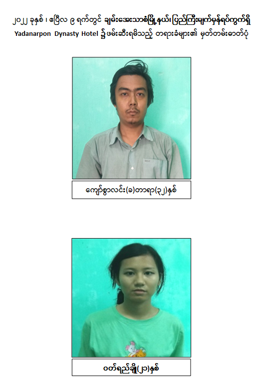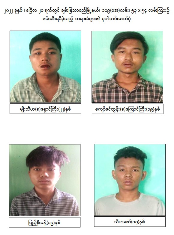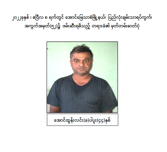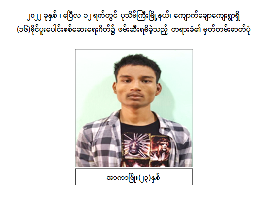 သို့ဖြစ်ပါ၍ ဖမ်းဆီးရမိတရားခံများအား ဥပဒေအရထိရောက်စွာ အရေးယူနိုင်ရေး ဆက်လက် ဆောင်ရွက်သွားမည်ဖြစ်ပြီး အကြမ်းဖက်မှု ဆောင်ရွက်နေသူများအား ပြည်သူတစ်ရပ်လုံးက ဝိုင်းဝန်းကာကွယ် တိုက်ဖျက်ကြရန်နှင့် ပြစ်မှုကျူးလွန်ရာတွင် ပါဝင်ပတ်သက်သူများ၊ နောက်ကွယ်မှ ထောက်ပံ့ပေးလျက်ရှိသော ဆက်စပ် တရားခံများအား အမြန်ဆုံးဖမ်းဆီးရမိရေး အတွက် ၎င်းတို့ပုန်းခိုရာနေရာများ၊ လှုပ်ရှားသွားလာနေထိုင်မှု သတင်းများရရှိပါက သက်ဆိုင်ရာသို့ လျှို့ဝှက်စွာသတင်းပေး တိုင်ကြားနိုင်ပါကြောင်း၊ သတင်းပေးသူနှင့် ဖမ်းဆီးပေးသူများအား ထိုက်တန်စွာလျှို့ဝှက်၍ ဆုငွေများ ပေးအပ်ချီးမြှင့်လျက်ရှိကြောင်းနှင့် မြို့ရွာများ အမြန်ဆုံး အေးချမ်းတည်ငြိမ်ရေးအတွက် ပြည်သူတစ်ရပ်လုံး ပူးပေါင်းပါဝင်ကြိုးပမ်း ဆောင်ရွက်နိုင်ပါရန် မေတ္တာရပ်ခံအပ်ပါကြောင်း အသိပေး သတင်းထုတ်ပြန်အပ်ပါသည်။