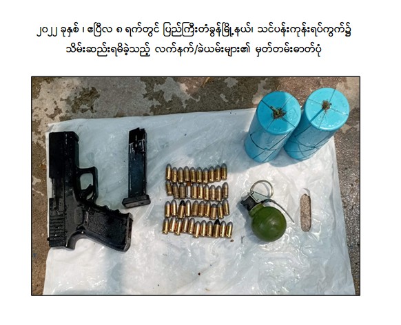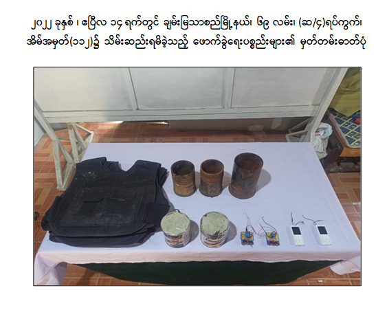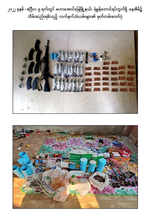 ဖမ်းဆီးရမိတရားခံများ၏ ထွက်ဆိုချက်အရ ဧပြီလ ၉ ရက် နံနက်ပိုင်းတွင် ချမ်းအေးသာစံ မြို့နယ်၊ ပြည်ကြီးမျက်မှန်ရပ်ကွက်ရှိ Yadanarpon Dynasty Hotel ၌ ကျော်စွာလင်း (ခ)တာရာ (၃၂)နှစ်နှင့် ဝတ်ရည်ချို (၂၁)နှစ်တို့ ၂ ဦးအား ဖမ်းဆီးရမိ ခဲ့ပြီး မဟာအောင်မြေမြို့နယ်၊ ရဲမွန်တောင်ရပ်ကွက်ရှိ ကျော်စွာလင်း(ခ)တာရာ ငှားရမ်းထားသော နေအိမ်၌ KA-25 သေနတ် ၁ လက်၊ လက်လုပ်သေနတ် ၁ လက်၊ ကျည်အိမ် ၇ ခု၊ ကျည်မျိုးစုံ ၃၂၆ တောင့်၊ အီနာဂါဗုံးသီး ၂၅ လုံး၊ လက်ပစ်ဗုံး ၅ လုံး၊ လက်လုပ်မိုင်း ၆ လုံး၊ ဒီတိုနေတာ ၃၇၅ ချောင်း၊ Keypad ဖုန်း ၂၀ လုံး၊ ဖောက်ခွဲရေးဆက်စပ် ပစ္စည်းများအား သိမ်းဆည်းရမိခဲ့ပါသည်။
