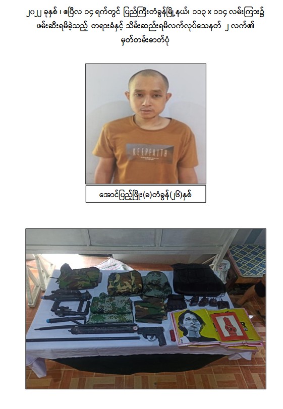 နိုင်ငံတော်အစိုးရအနေဖြင့် CRPH ၊ NUG နှင့် PDF အမည်ခံအကြမ်းဖက်အဖွဲ့များမှ ပြည်သူလူထုအား လုပ်ကြံသတ်ဖြတ်ခြင်းနှင့် နိုင်ငံတော်အစိုးရ၏ အုပ်ချုပ်မှုယန္တရား ပျက်ပြားစေရန်အတွက် အစိုးရနှင့် ချိတ်ဆက်ဆောင်ရွက်လျက်ရှိသည့် ပြည်သူလူထုပိုင် အဆောက်အဦများအား အကြောင်းမဲ့ဖောက်ခွဲဖျက်ဆီးခြင်း၊ အပြစ်မဲ့ပြည်သူများအား ထိတ်လန့် ကြောက်ရွံ့စေရန် ဖောက်ခွဲဖျက်ဆီးခြင်းစသည့် အကြမ်းဖက်လုပ်ရပ်များအား ဆောင်ရွက်နိုင်မှု မရှိစေရေး ဖော်ထုတ်ဖမ်းဆီးခြင်းများအား နေ့/ညမပြတ် ဆောင်ရွက်လျက်ရှိရာ ၂၀၂၂ ခုနှစ်၊ ဧပြီလ ၈ ရက် ညပိုင်းတွင် မန္တလေးတိုင်းဒေသကြီး၊ မဟာအောင်မြေမြို့နယ်၊ အောင်ချမ်းအေး ရပ်ကွက်နေ စည်သူ(ခ) ဆိတ်ကြီး(၄၀)နှစ်၊ ပြည်ကြီးတံခွန်မြို့နယ်၊ သင်ပန်းကုန်းရပ်ကွက်နေ အောင်ကျော်မိုး (ခ)မိုးမိုး(၃၈)နှစ်နှင့် အောင်မြေသာစံမြို့နယ်၊ ပြည်လုံးချမ်းသာရပ်ကွက်၊ အကွက်အမှတ် (၅၂)နေ အောင်ထွန်းလင်း(ခ)ပါပူး(၄၄)နှစ်တို့ ၃ ဦးအား ၉ မမ ပစ္စတို ၁ လက်၊ ကျည်အိမ် ၁ ခု၊ ကျည် ၄၁ တောင့်၊ လက်ပစ်ဗုံး ၁ လုံး၊ လက်လုပ်မိုင်း ၂ လုံးတို့နှင့်အတူ ဖမ်းဆီးရမိခဲ့သည်။