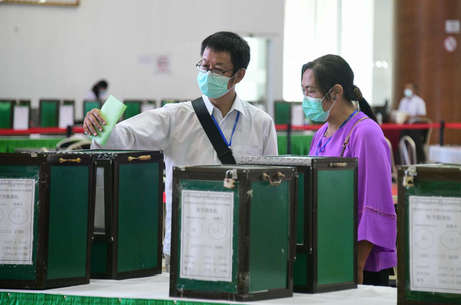 မွန်းလွဲပိုင်းတွင် မြန်မာ့ကျောက်မျက်ရတနာပြပွဲ ဗဟိုကော်မတီနာယက သယံဇာတနှင့် သဘာဝပတ်ဝန်းကျင်ထိန်းသိမ်းရေးဝန်ကြီးဌာန ပြည်ထောင်စုဝန်ကြီး ဦးခင်မောင်ရီနှင့် ပြပွဲဗဟိုကော်မတီဝင်များသည် မဏိရတနာကျောက်စိမ်းခန်းမအတွင်းရှိ ကျောက်စိမ်းအတွဲများ အိတ်ဖွင့်တင်ဒါစနစ်ဖြင့် ရောင်းချပေးနေမှုကို ကြည့်ရှုအားပေးသည်။