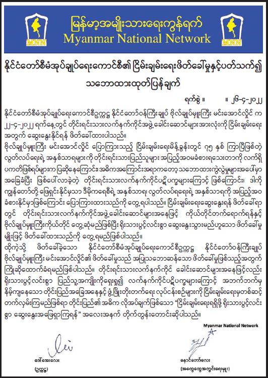 နိုင်ငံတော်စီမံအုပ်ချုပ်ရေးကောင်စီ၏ ငြိမ်းချမ်းရေးဖိတ်ခေါ်မှုနှင့်ပတ်သက်၍ မြန်မာအမျိုးသားရေးကွန်ရက်၏ သဘောထားထုတ်ပြန်ချက်