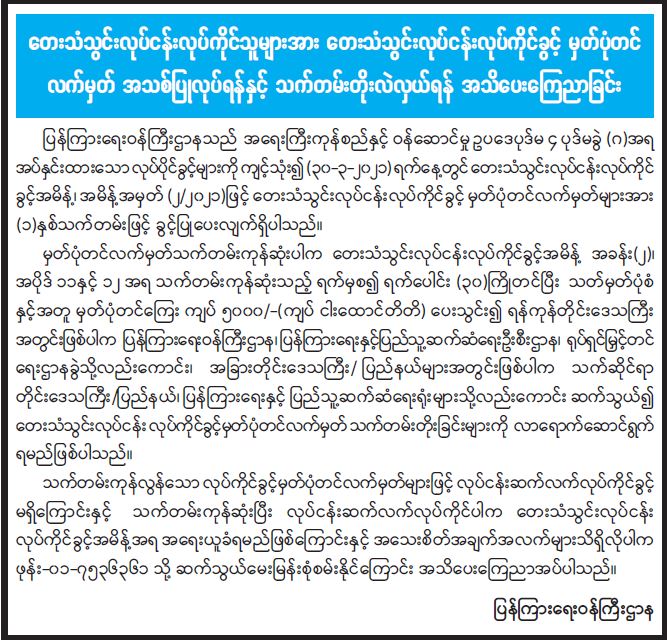 တေးသံသွင်းလုပ်ငန်းလုပ်ကိုင်သူများအား တေးသံသွင်းလုပ်ငန်းလုပ်ကိုင်ခွင့် မှတ်ပုံတင်လက်မှတ် အသစ်ပြုလုပ်ရန်နှင့် သက်တမ်းတိုးလဲလှယ်ရန် အသိပေးကြေညာခြင်း